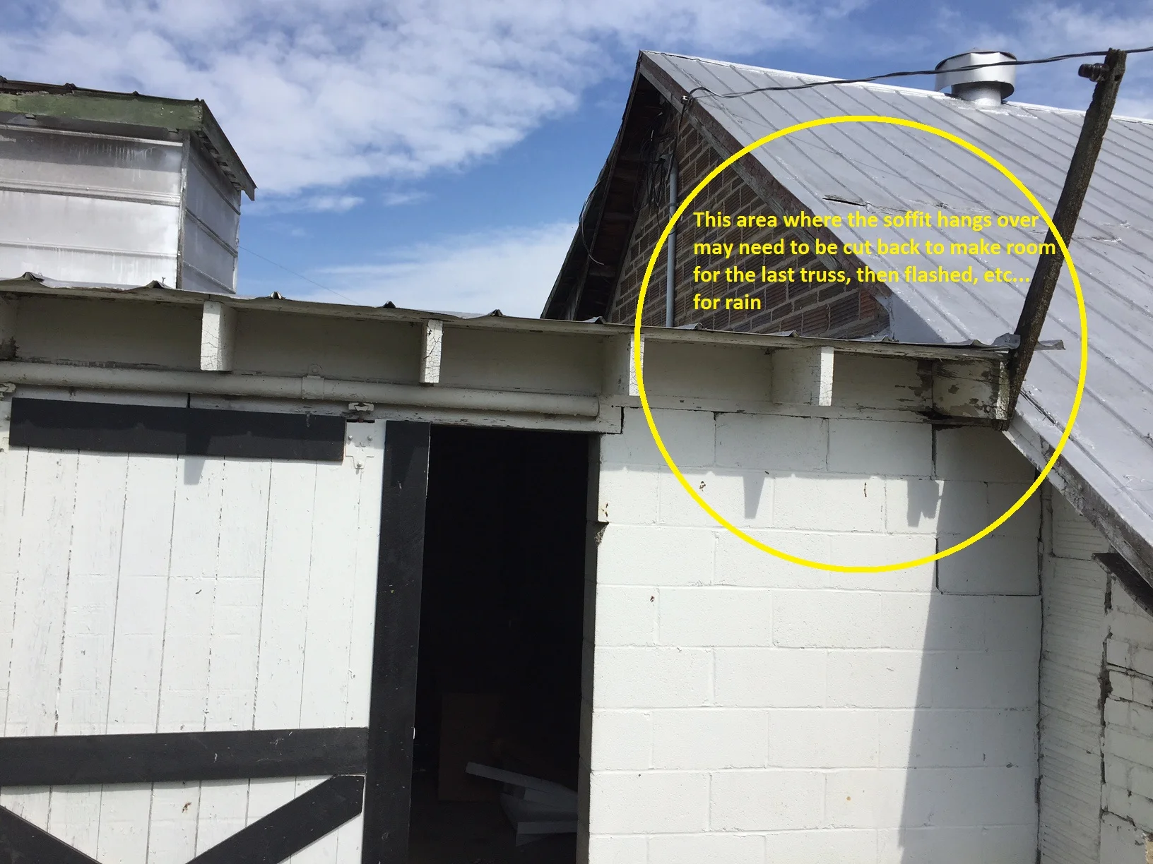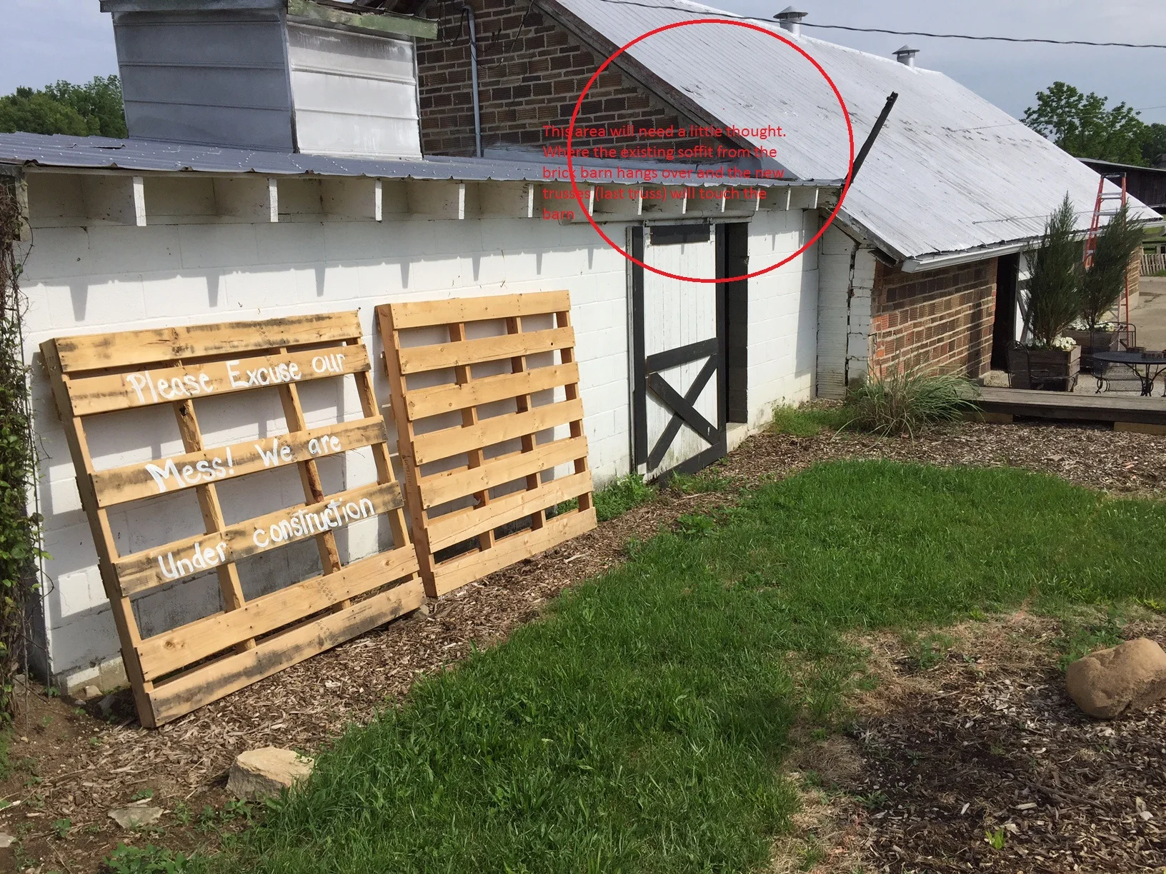 This is where there will need to be some thinking in regards to the soffit from the existing brick barn, as to where it meets up with the new bathroom trusses